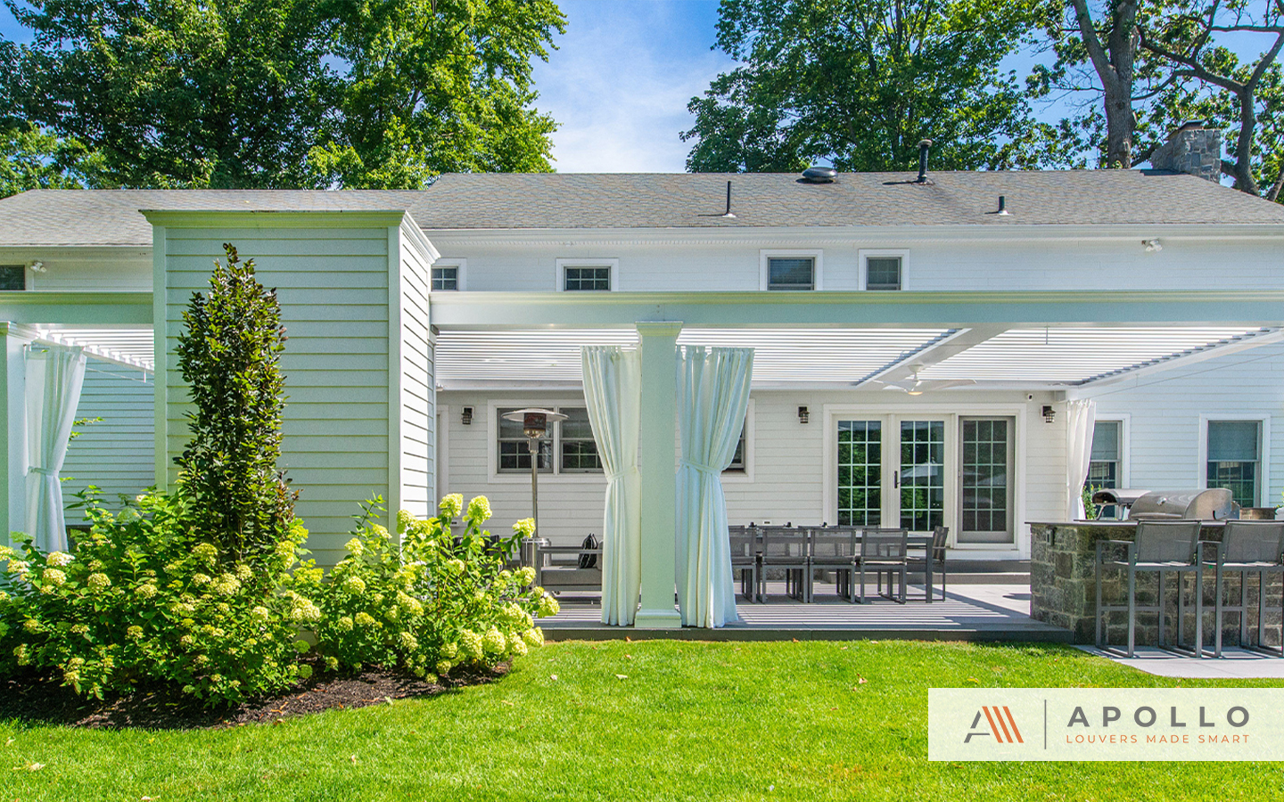 Apollo Louvers pergola shades a modern patio with dining and BBQ area in a landscaped yard