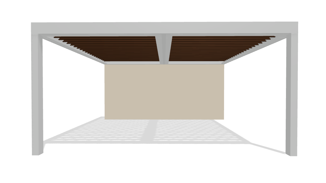 2 Bays • Wall-Attached • 19’6″ W × 16’0″ Projection • White Frame & Gutter • Bronze Louvers • Integrated Lighting • Ceiling Fan • Media Wall • Stone-Clad Aluminum Posts
