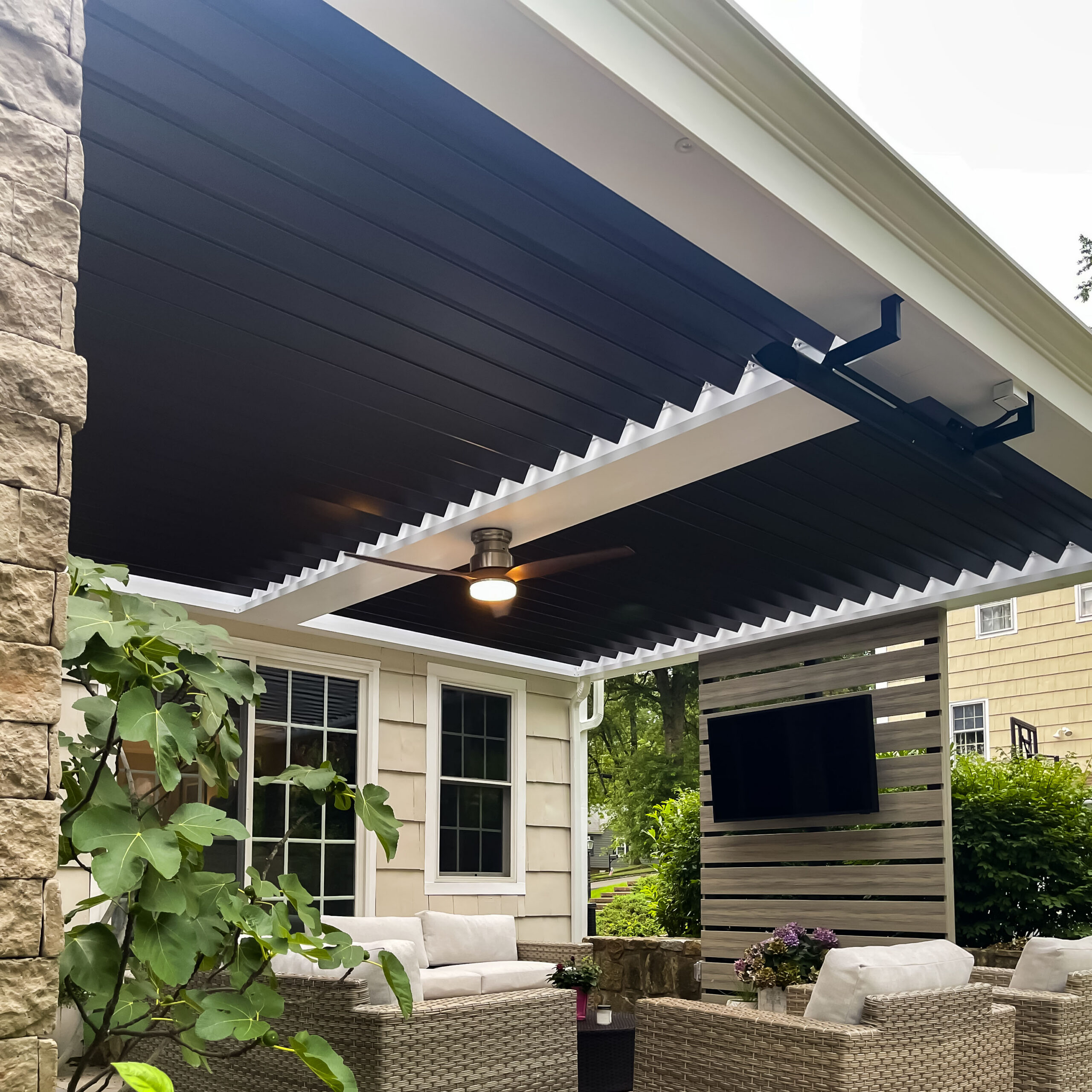 This Morristown project creates a comfortable and refined outdoor living space that feels like a natural extension of the home. The wall-attached louvered pergola brings together shade, airflow, and modern style while keeping the patio open and inviting. With its white frame, bronze louvers, integrated lighting, ceiling fan, custom media wall, and stone-clad aluminum posts, the space delivers a polished setting for everyday relaxation and easy entertaining.